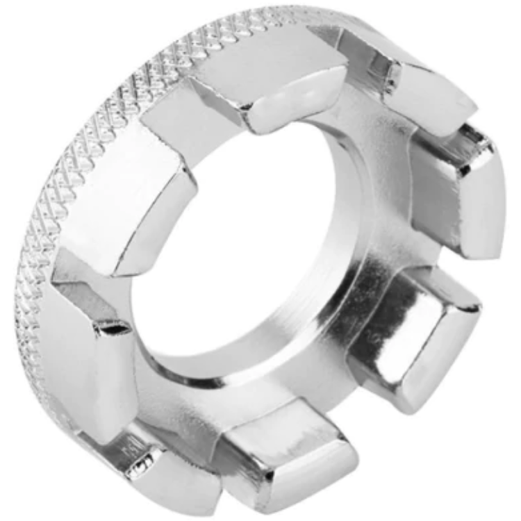 A must have item for any keen cyclist.Keep your spokes straight and true. Light and portable.Suitable for spoke nipple sizes 10, 11, 12, 13, 14.15Colour: SilverWeight: 59g