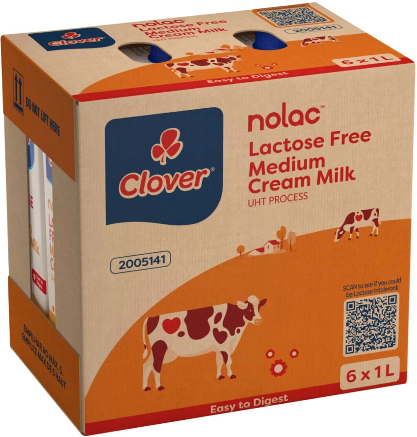 Clover NoLac Lactose Free Medium Fat UHT Milk - 6 x 1L