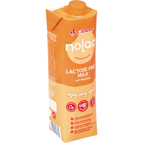 Clover Nolac is pre-treated with the enzyme lactase to break down lactose, making it easier to digest for the lactose intolerant person. This process also gives Clover Nolac a sweeter taste than regular milk, but without the added sugar! We have also added Calcium and Vitamin D, which are nutrients known to be lacking in the diet of a lactose intolerant person. This delicious, creamy taste of dairy can be enjoyed on its own, in tea and coffee, with cereal, and is ideal for use in cooking and baking. Now you can be free with lactose free. Clover Nolac is a delicious long-life milk, high in the nutrients often lacking in a lactose-free diet.