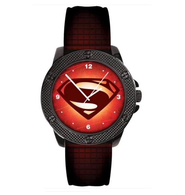 DC Watch Collection: Superman – Man Of Steel Watch: DC-ML-04 Movie Logo Steries: Man of Steel (TM) Case Material: Alloy Strap Material: Red Silicone Movement: Japanese Quartz Face Height: 33mm Face Width: 33mm Plus a collector tin and a 12 page collector booklet.