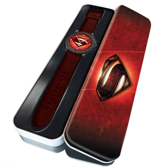 DC Watch Collection: Superman – Man Of Steel Watch: DC-ML-04 Movie Logo Steries: Man of Steel (TM) Case Material: Alloy Strap Material: Red Silicone Movement: Japanese Quartz Face Height: 33mm Face Width: 33mm Plus a collector tin and a 12 page collector booklet. What's In The Box 1 x DC...
