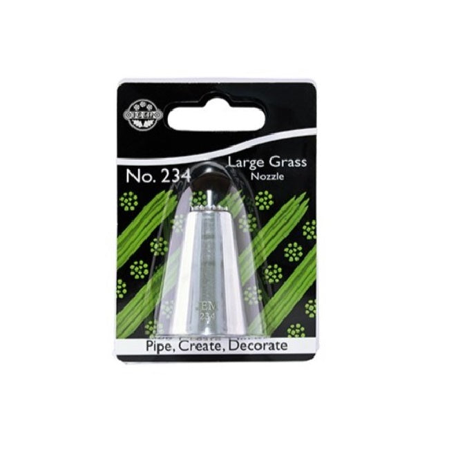 JEM Nozzle - Large Hair / Grass M/O Serrated #234 Great for creating buttercream grass designs for your cakes and cupcakes Dimensions: tip diameter 2.5 mm base diameter 25 mm height 40 mm PRODUCT DESCRIPTION JEM Large Grass Piping Nozzle no. 234 All of our nozzles work with parchment, disposable and fabric piping bags. Why not use them with an adaptor to allow easy and mess free changing between nozzles. Made from high quality seamless stainless steel. Wash these with warm soapy water, or why not use one of our cleaners to keep them fresh.