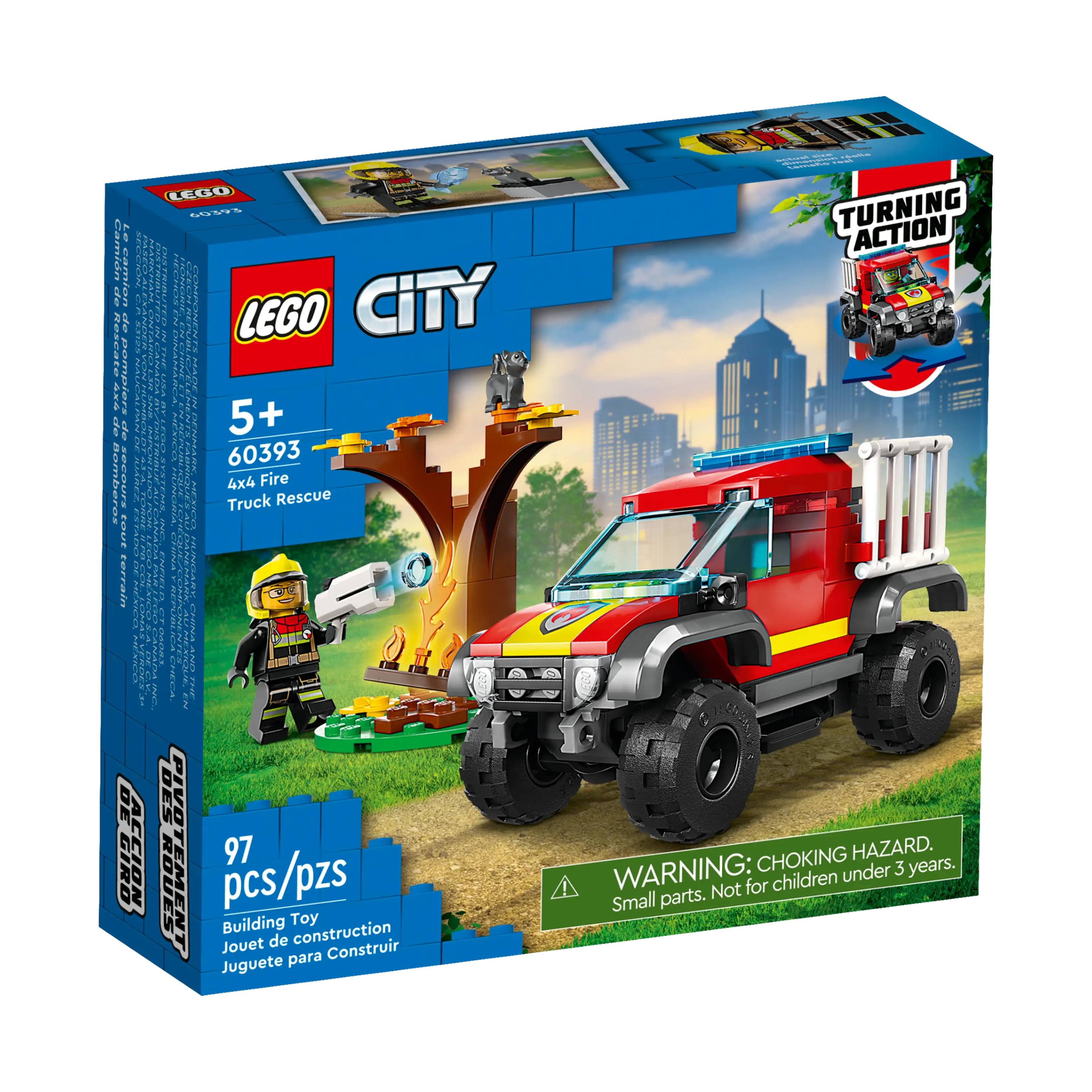 Fire up kids’ creative imaginations with the LEGO City 4x4 Fire Truck Rescue (60393) toy playset, featuring a neat 4x4 with chunky tires, an opening cockpit and a detachable LEGO water element launcher. This set also includes a campfire setting with LEGO flames, plus a firefighter minifigure and cat figure....